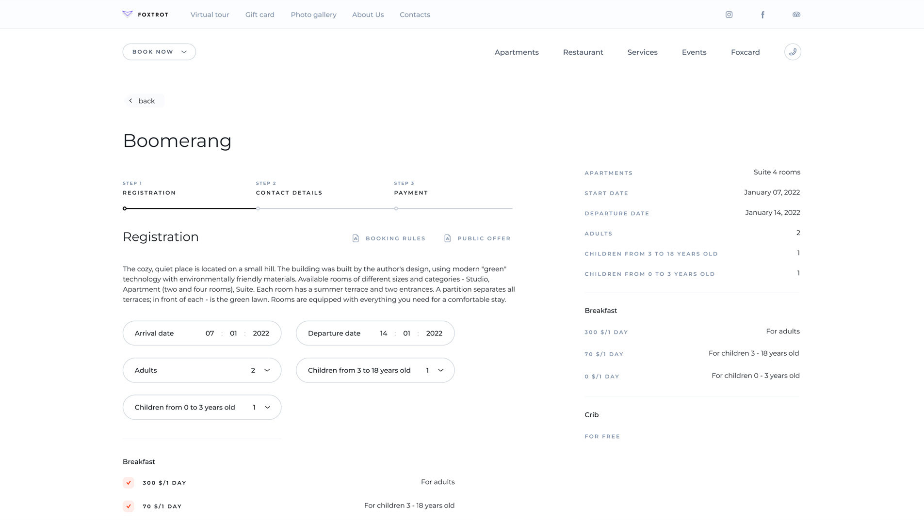 Foxtrot is a comfortable country family vacation complex located on the East Atlantic coast of the United States. The complex includes active recreation areas (bowling, billiards, fitness, golf, and winter entertainment), as well as a restaurant and spa area.